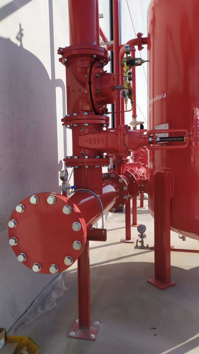 Instalación de grupo de presión contra incendios para un caudal de 60 m3/h a 65 m.c.a. y dos depósitos de reserva de agua de 30.000 litros cada uno en posición vertical en superficie.