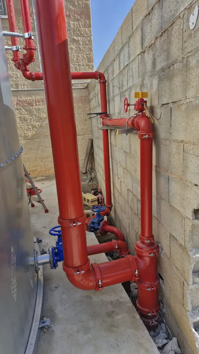 Instalación de grupo de presión contra incendios para un caudal de 60 m3/h a 65 m.c.a. y dos depósitos de reserva de agua de 30.000 litros cada uno en posición vertical en superficie.