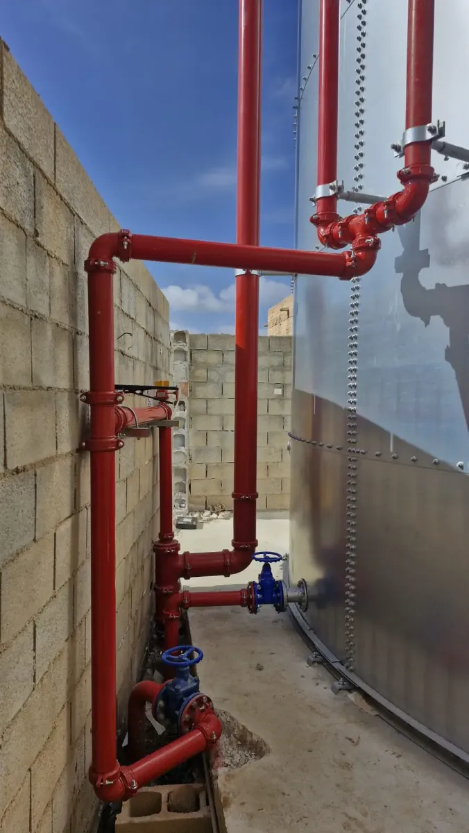 Instalación de grupo de presión contra incendios para un caudal de 60 m3/h a 65 m.c.a. y dos depósitos de reserva de agua de 30.000 litros cada uno en posición vertical en superficie.