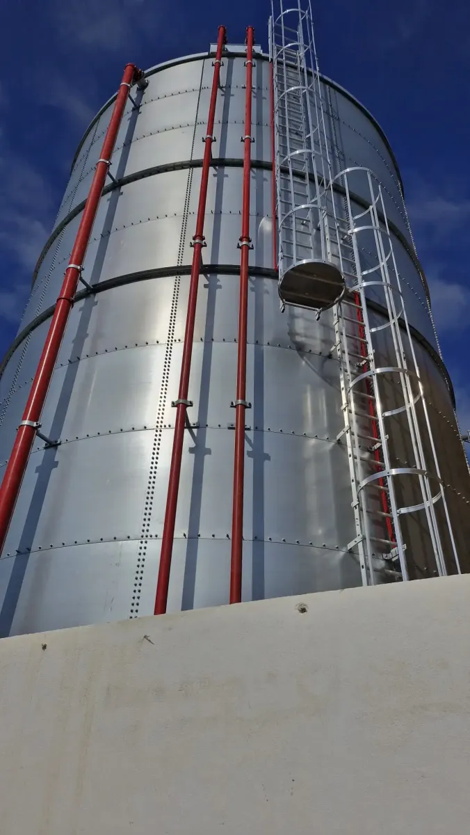 Instalación de grupo de presión contra incendios para un caudal de 60 m3/h a 65 m.c.a. y dos depósitos de reserva de agua de 30.000 litros cada uno en posición vertical en superficie.